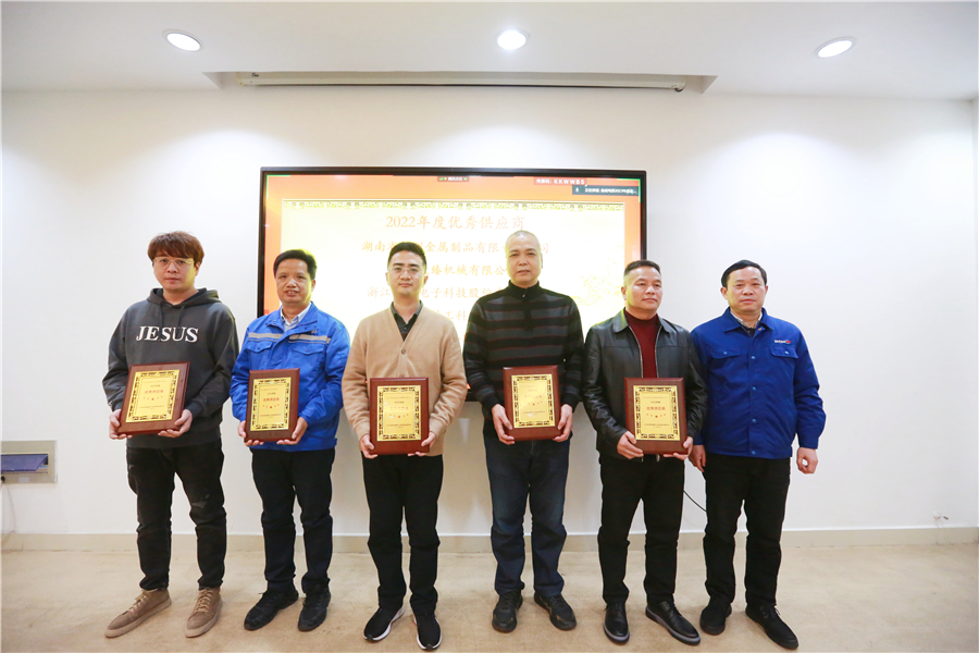 會議對2022年度優(yōu)勝供應(yīng)商進(jìn)行了通報表彰,經(jīng)公司綜合評定,共評選出2022年度優(yōu)秀供應(yīng)商獎5個、質(zhì)量優(yōu)勝獎5個、新產(chǎn)品開發(fā)獎5個。公司黨委書記、董事長龍美彪,黨委副書記、總經(jīng)理譚新民,常務(wù)副總譚愛平等高層領(lǐng)導(dǎo)為參加主會場現(xiàn)場會議的獲獎供應(yīng)商代表頒獎。